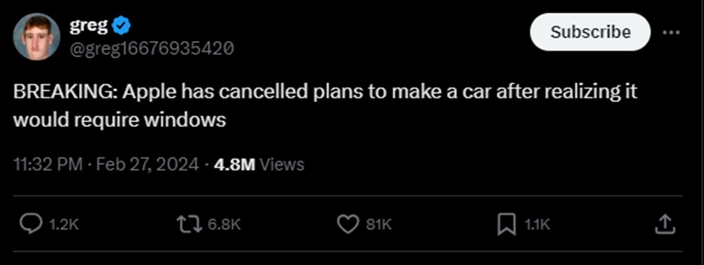 ABD’li teknoloji devi Apple’ın, elektrikli araba üretmeye yönelik çalışmalarını sonlandıracağı ve bu ünitedeki birçok çalışanın üretken yapay zeka projelerine odaklanacağı bildirildi. Proje üzerinde çalışanları işten çıkarmaya hazırlandığını bildiren Apple, toplumsal medya kullanıcıları tarafından alay konusu oldu. X’te (eski ismiyle twitter) bir kullanıcı, rakip teknoloji firması Microsoft’a gönderme yaparak, “SON DAKİKA: Apple, Windows gerektirdiğin fark ettikten sonra otomobil üretme planlarını iptal etti” dedi.