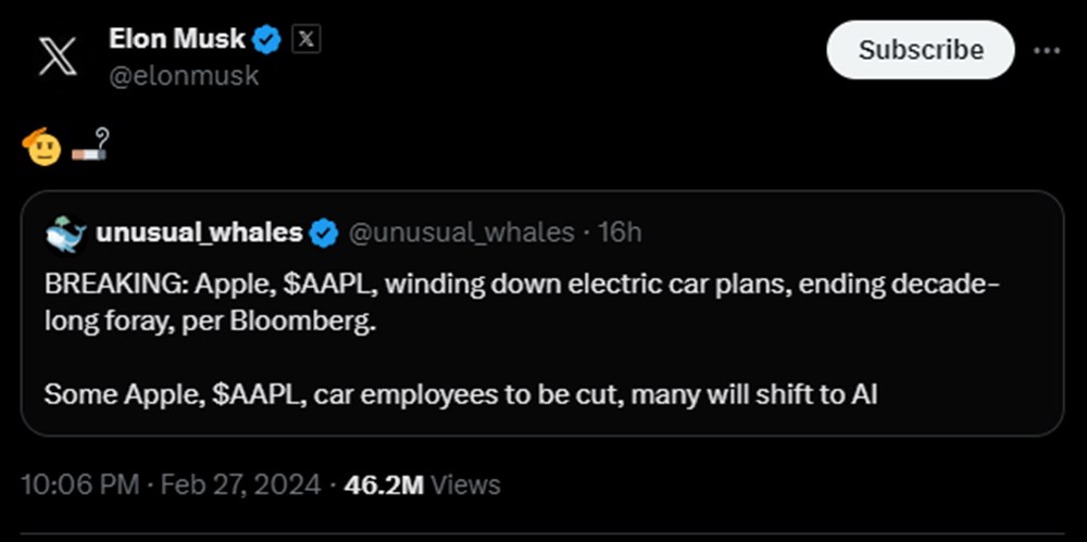 Rakip firma Tesla’nın sahibi Elon Musk da X’teki haberlere sözlerle cevap verdi.