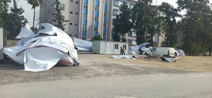 Kahramanmaraşlı depremde evleri yıkılan ve hasar gören vatandaşların kaldıkları çadırlar, saatte 30 kilometreye ulaşan rüzgarda yerle bir oldu.