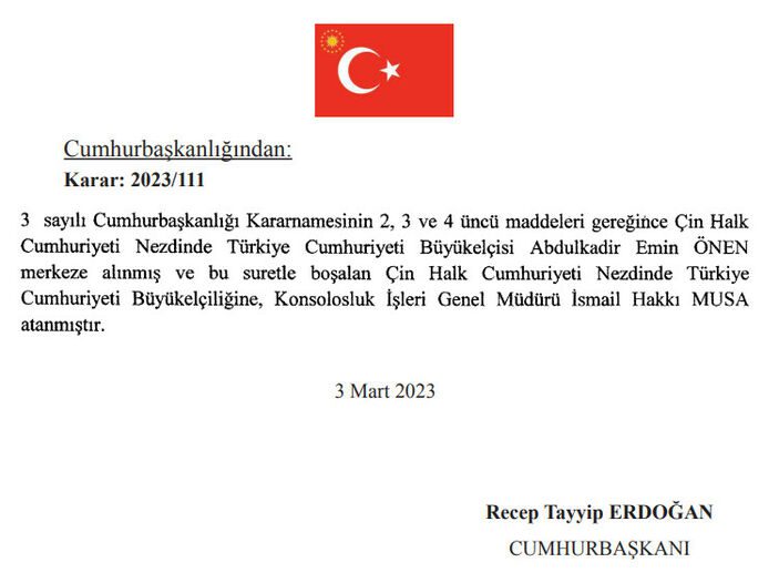 Cumhurbaşkanı Recep Tayyip Erdoğan’ın imzasıyla Resmi Gazete’de yayımlanan karara göre, Türkiye’nin Pekin Büyükelçisi Abdulkadir Emin Önen merkeze alındı. Bu suretle boşalan söz konusu göreve Konsolosluk İşleri Genel Müdürü Musa getirildi.