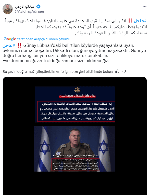 İsrail ordusu sözcüsü Avichai Adraee, X hesabından yaptığı açıklamada, hücumların düzenleneceği bölgeleri duyurarak, “Güvenliğiniz için konutunuzu derhal tahliye etmelisiniz, Avali Irmağı’nın kuzeyine geçin. Hayatınızı kurtarın.” tabirlerini kullandı.