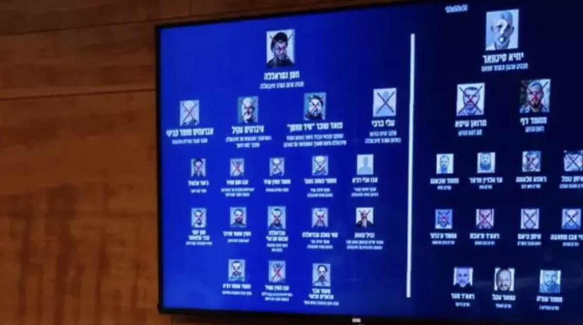 İsrailli yetkililerin yüzlerinin gizlendiği fotoğrafta, Hizbullah ve Hamas üst seviye isimlerinin duvarda asılı televizyonda yer aldığı görüldü. Televizyondaki imgede, Gazze Şeridi’ne düzenlenen taarruzlarda öldürüldüğü iddia edilen Hamas lideri Yahya Sinvar’ın fotoğrafının üstünde soru işaretinin bulunduğu fark edildi.