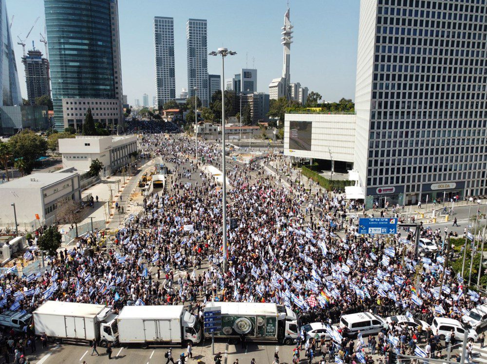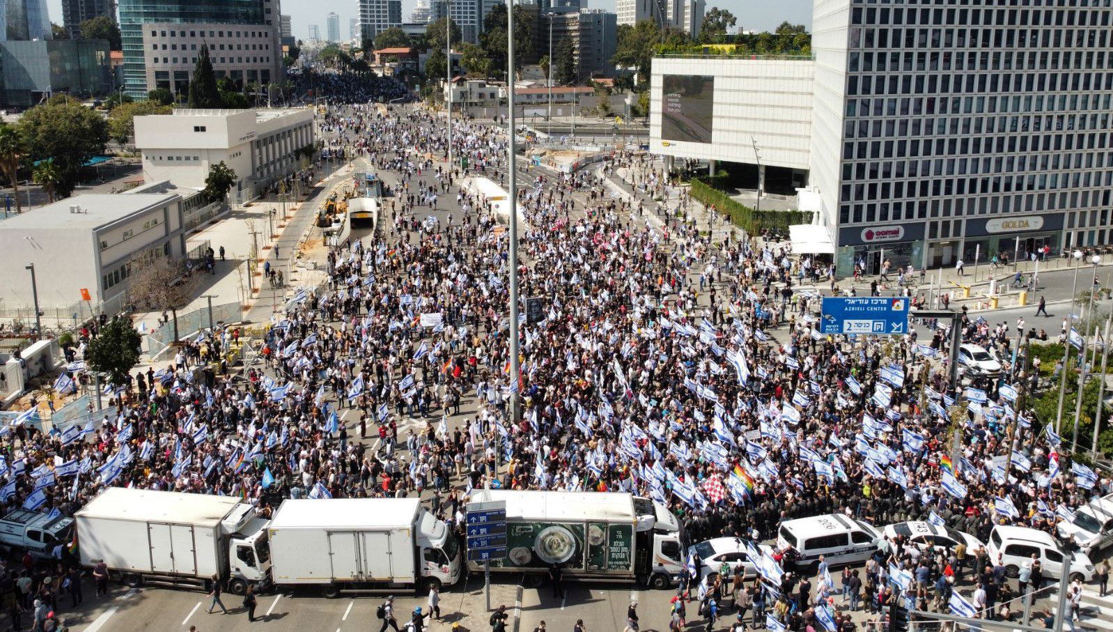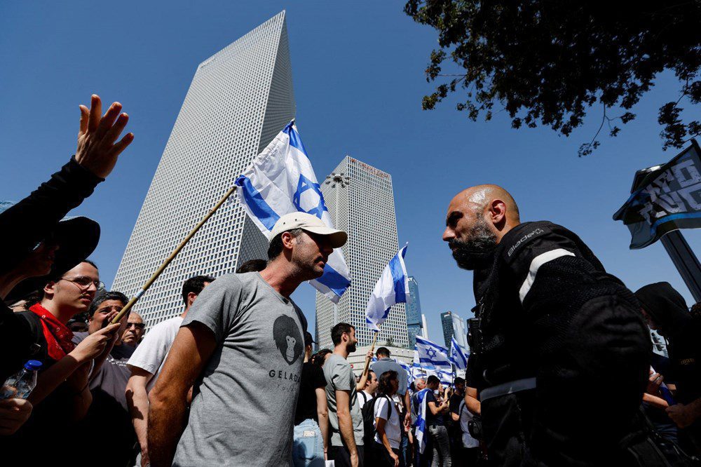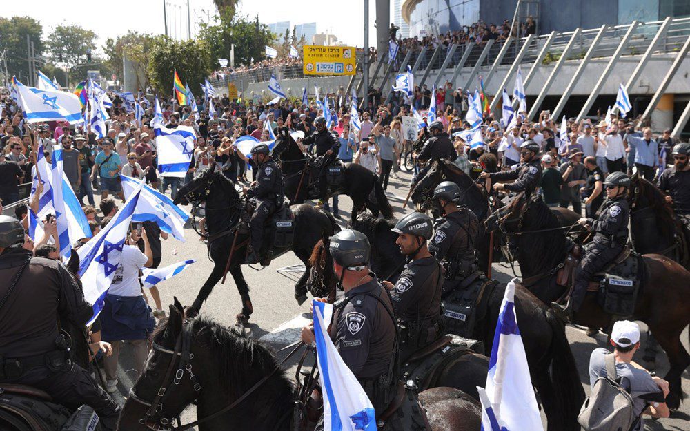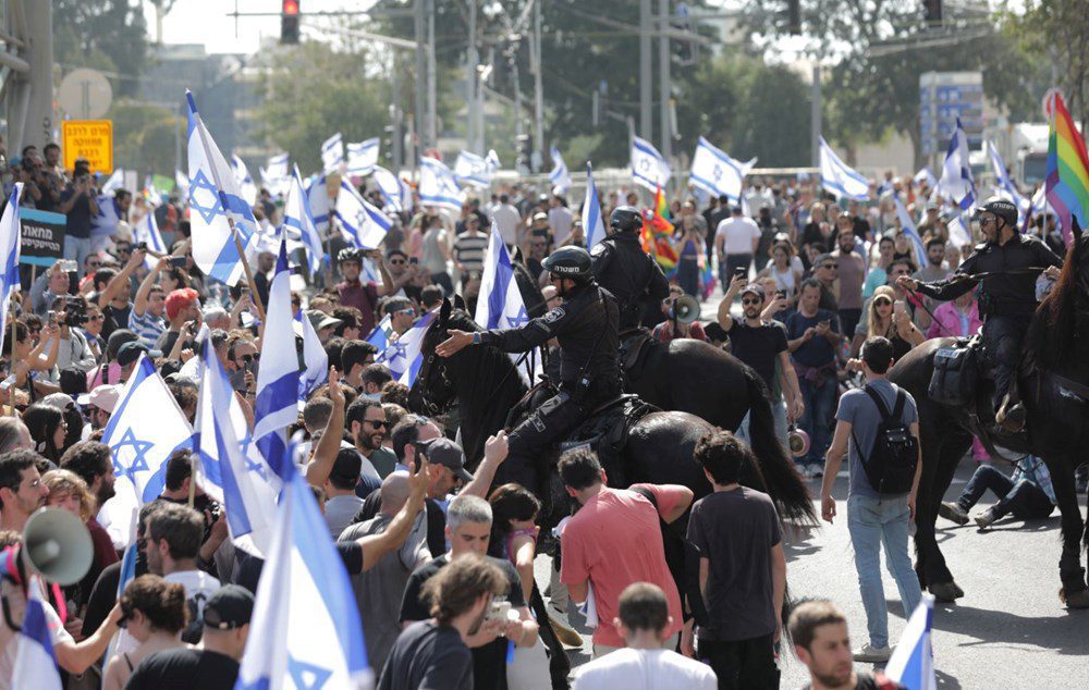 İsrail’de Başbakan Binyamin Netanyahu hükümetinin tartışmalı yargı reformuna yönelik protestolar devam ediyor. Başkent Tel Aviv’de bir araya gelen yüzlerce kişi, ellerindeki İsrail bayrakları ile Netanyahu hükümetinin “yargıyı zayıflatma” girişimlerine tepki gösterdi. Başkentteki bir anayolu trafiğe kapatan göstericilere polis sert şekilde müdahale etti. Göstericileri dağıtmak için göz yaşartıcı gaz, ses bombası, tazyikli su ve atlı polisler kullanıldı.