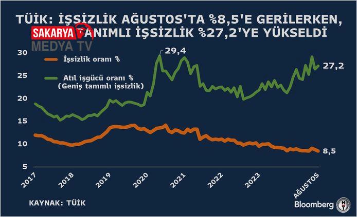 Hanehalkı İşgücü Araştırması sonuçlarına nazaran; 15 ve daha üst yaştaki bireylerde işsiz sayısı 2024 yılı Ağustos ayında bir evvelki aya nazaran 89 bin kişi azalarak 3 milyon 55 bin kişi oldu. İşsizlik oranı ise 0,3 puan azalarak yüzde 8,5 düzeyinde gerçekleşti. İşsizlik oranı erkeklerde yüzde 7,0 iken bayanlarda yüzde 11,4 olarak iddia edildi.