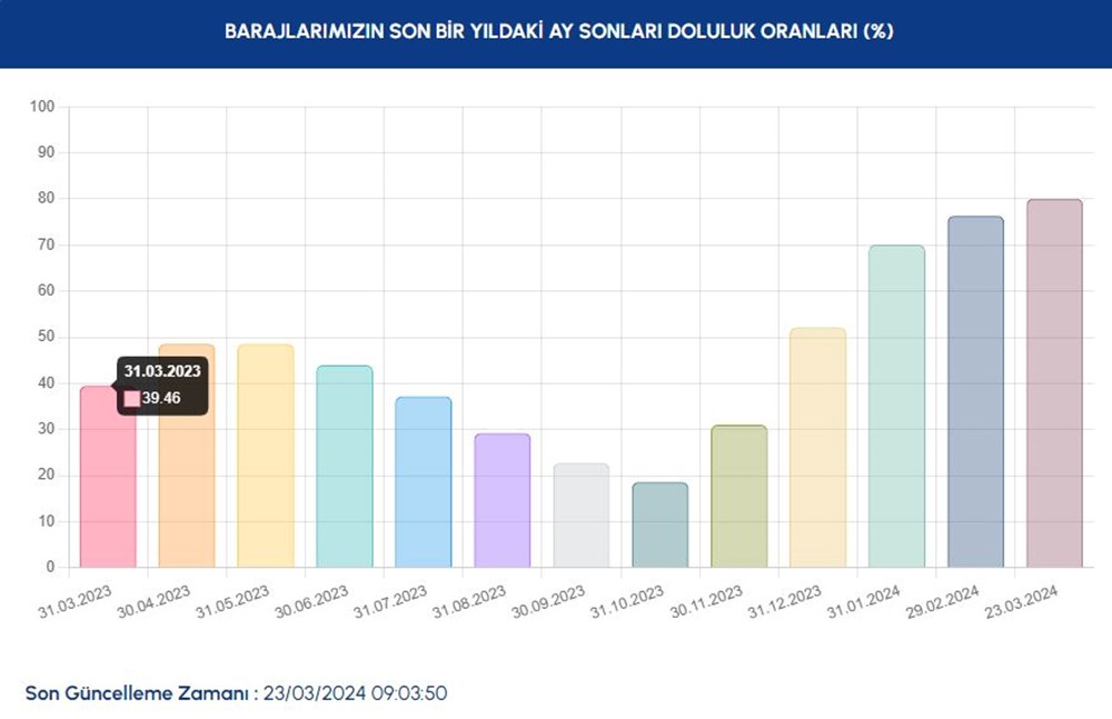 İSKİ’nin yayımlandığı 23 Mart 2024 bilgilerine nazaran kente su sağlayan İstanbul barajlarından sevindiren bir haber geldi. Bir evvelki gün kente 2 milyon 948 bin metroküp su sağlanırken, bir müddettir tesirli olan yağışlar doluluk oranlarına olumlu yansıdı.