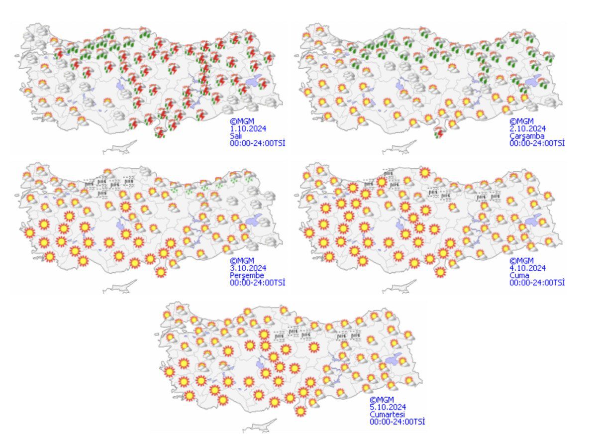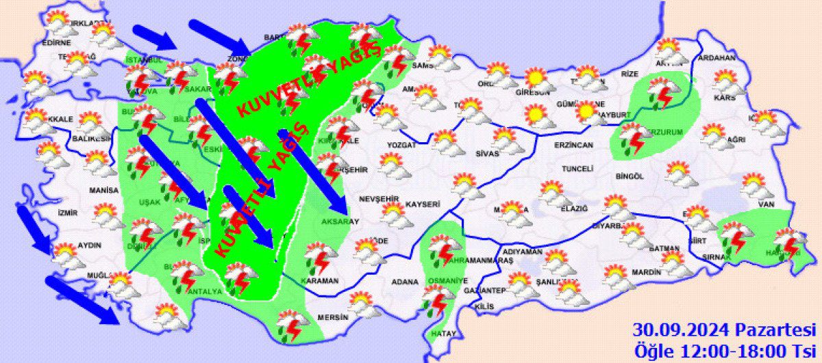 Rüzgarın; Batı Akdeniz’de kuzeyli taraflardan kuvvetli olarak (40-70 km/saat) esmesi bekleniyor. ADANA °C, 32°CAz bulutlu ve açık vakitle kesimli bulutlu, gece saatlerinden itibaren sağanak ve gök gürültülü sağanak yağışlıANTALYA °C, 25°CParçalı bulutlu, sağanak ve gök gürültülü sağanak yağışlı geçeceği varsayım ediliyor. Yağışların; doğusunun iç kesitlerinde lokal kuvvetli olması bekleniyor. HATAY °C, 31°CAz bulutlu ve açık vakitle kesimli bulutlu, sağanak ve gök gürültülü sağanak yağışlı geçeceği kestirim ediliyor. ISPARTA °C, 22°CParçalı bulutlu, sağanak ve gök gürültülü sağanak yağışlı geçeceği kestirim ediliyor. Yağışların; doğusunda mahallî kuvvetli olması bekleniyor.