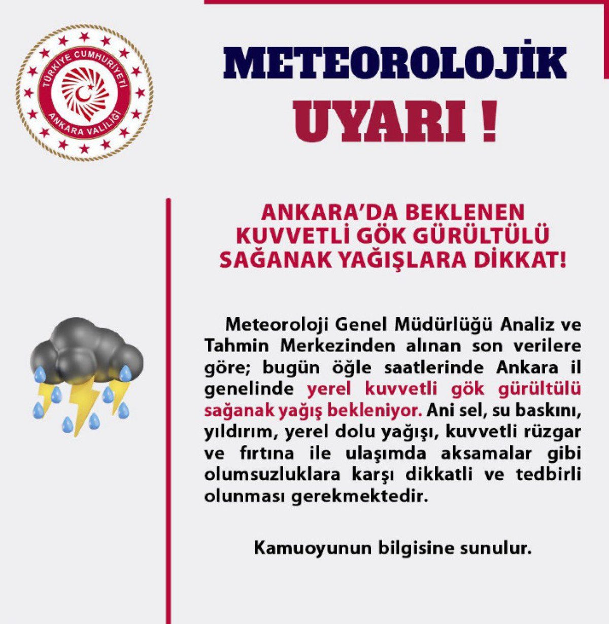 Tıpkı İstanbul’da olduğu üzere Ankara’da da beklenilen sağanak yağış nedeniyle valilikten açıklama geldi. Ankara Valiliği’nden yapılan açıklamada, “Meteoroloji Genel Müdürlüğü Ankara Bölge Varsayım ve Erken İkaz Merkezi datalarına nazaran; Bugün öğlen saatlerinden itibaren Ankara vilayet genelinde mahallî kuvvetli gök gürültülü sağanak yağış bekleniyor.Yaşanması beklenen aksiliklere karşı dikkatli ve önlemli olunmalıdır.” tabirlerine yer verildi.