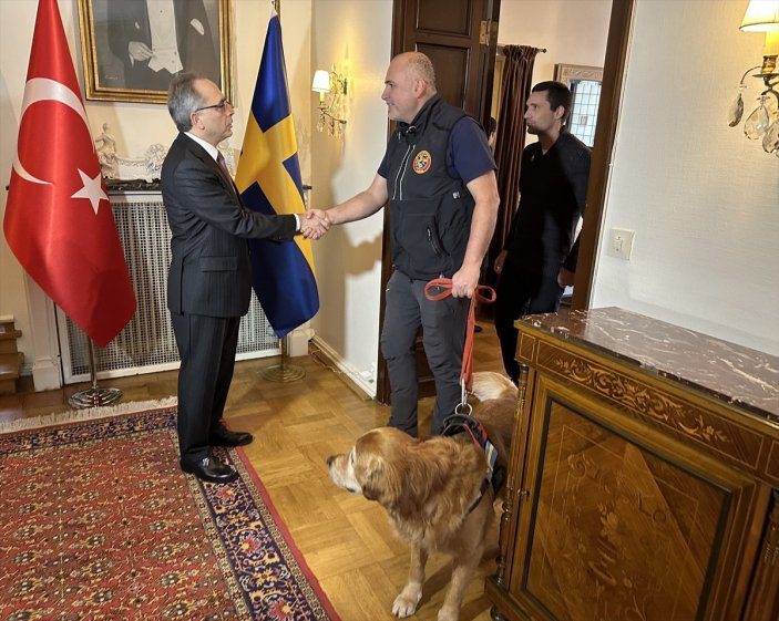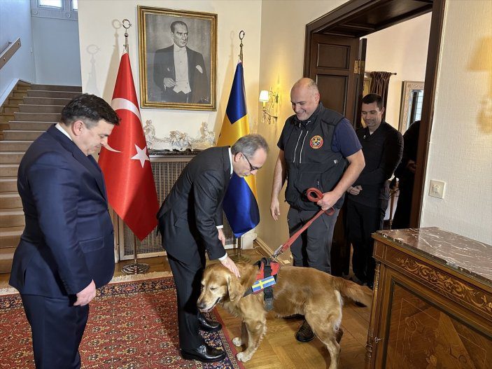 Resepsiyonda, enkaz altındaki 18 kişinin kurtarılmasını sağlayan arama kurtarma ekibinin köpeği Killian da yer aldı. Büyükelçi Tezel, deprem bölgesine kurtarma ekibi gönderen İsveç Acil Durum Ajansı’na teşekkür etti.