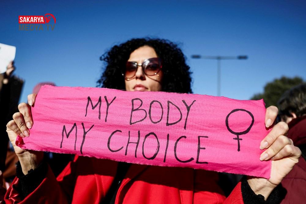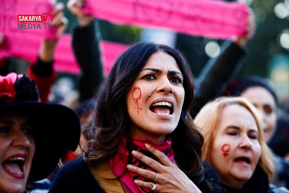 Göstericiler, “Ataerkilliği silahsızlandıralım” yazılı pankart taşıdı.