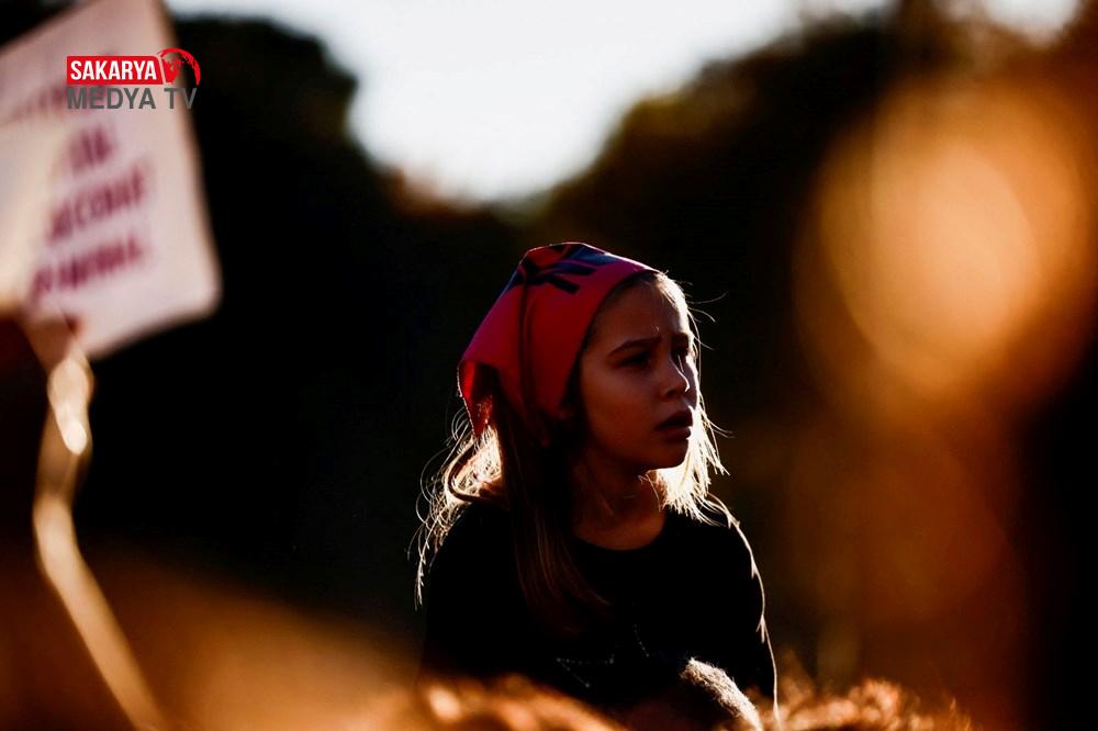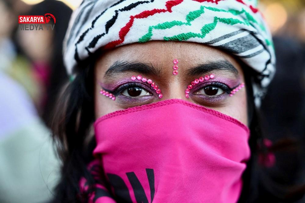 Sık sık “Özgür Filistin” sloganları atan protestocular dayanışma örneği sergiledi.