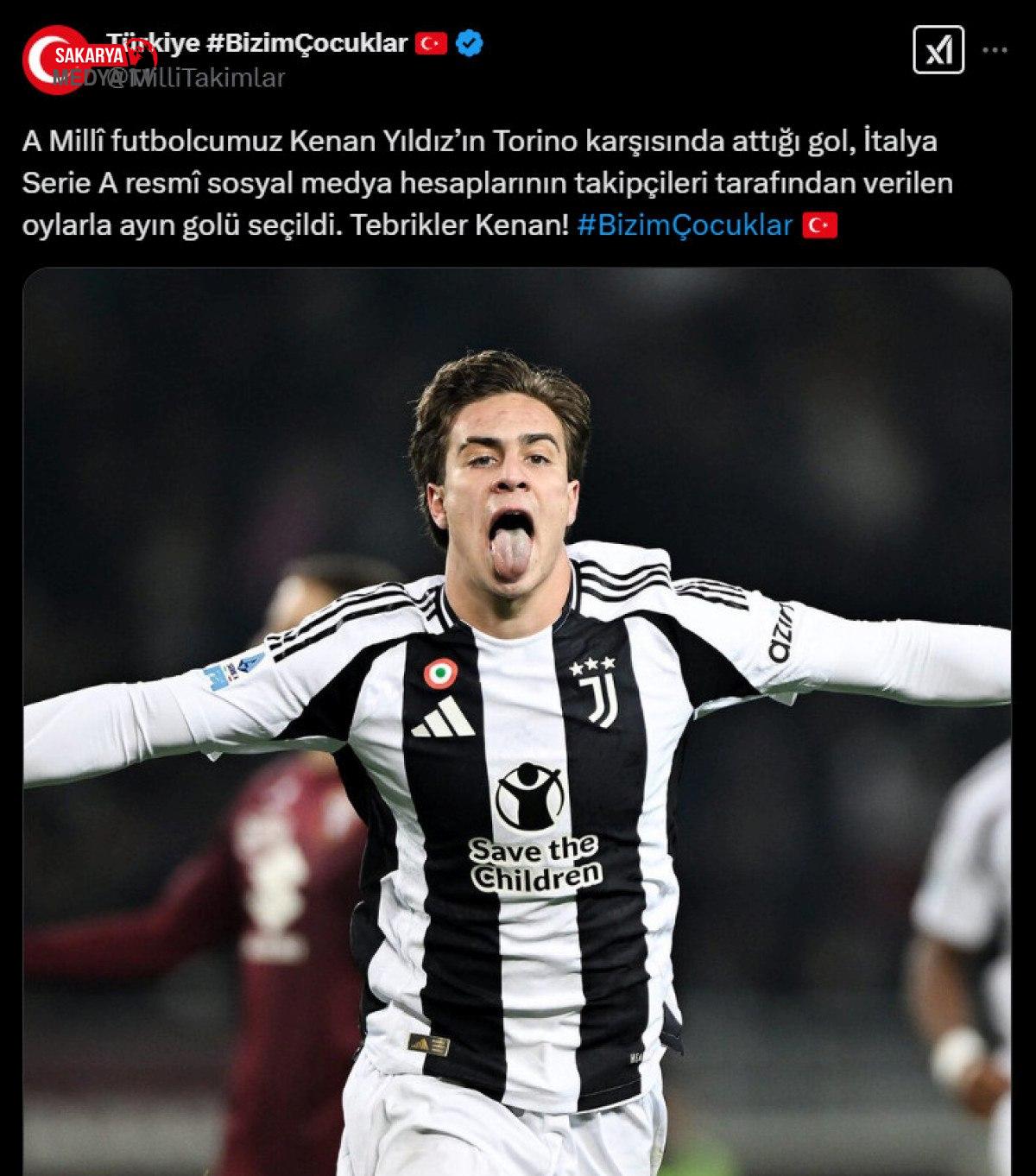 Paylaşımda, şu tabirlere yer verildi:A Ulusal futbolcumuz Kenan Yıldız’ın Torino karşısında attığı gol, İtalya Serie A resmi toplumsal medya hesaplarının takipçileri tarafından verilen oylarla ayın golü seçildi.