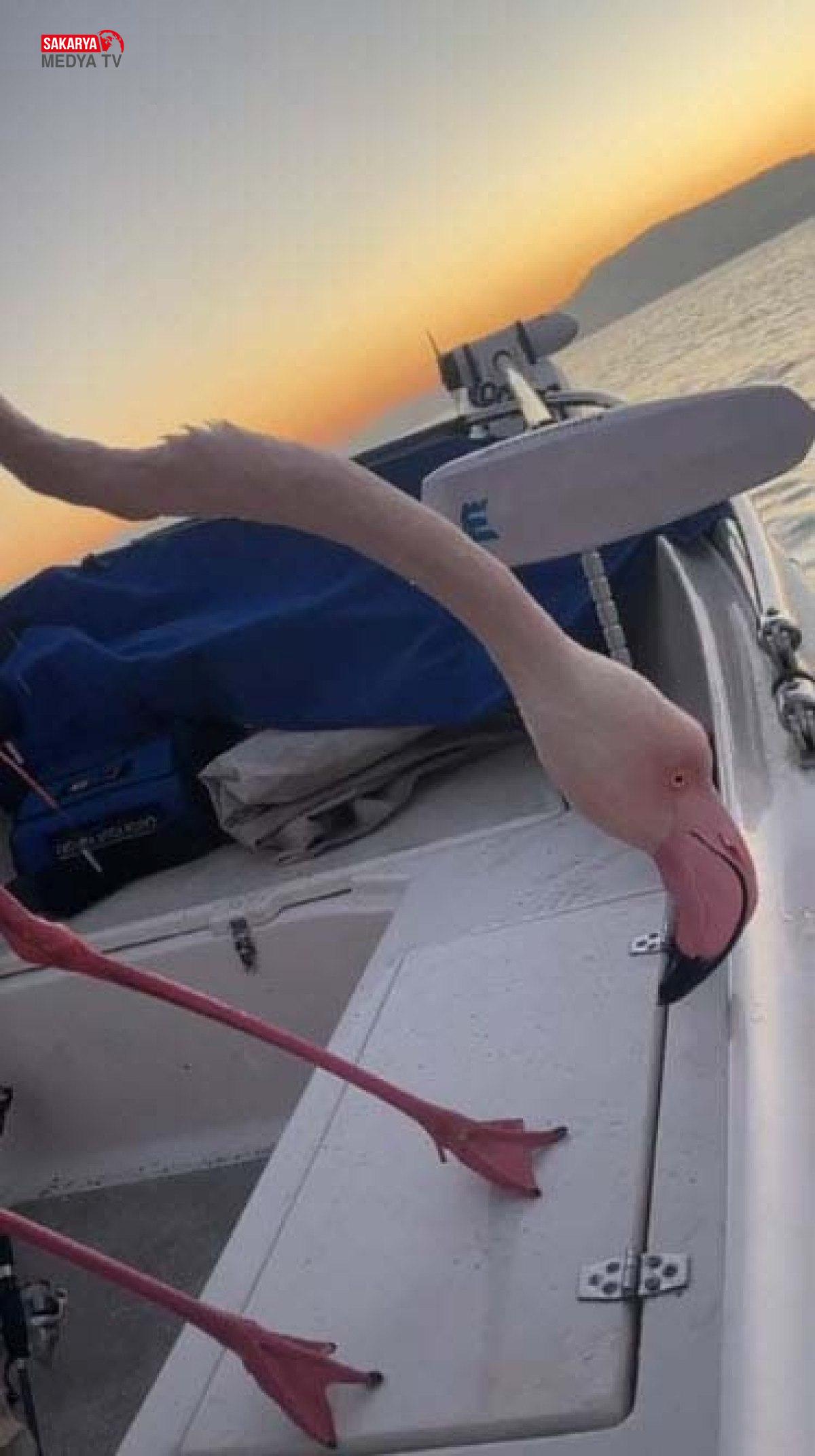 Uçamayan flamingoyu tekneye alan balıkçılar, üzerine dolanan misinadan kurtarıp, tekrar denize bıraktı.