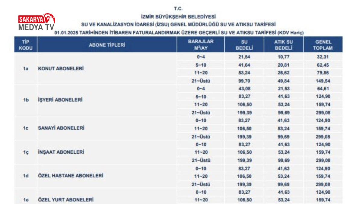 Haziran ayında İZSU Genel Müdürlüğü’nün Fevkalâde Genel Heyet Toplantısı’nda su ve atık su tarifelerindeki fiyatlarda düzenleme yapılmıştı.