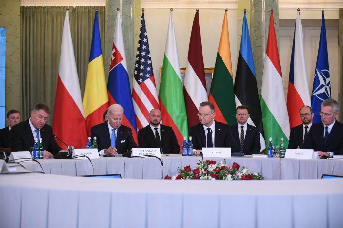 ABD Başkanı Joe Biden, Ukrayna’ya düzenlediği sürpriz ziyaretin ardından geldiği Polonya’da, 2014 yılında Rusya’nın Kırım’ı işgalinin ardından kurulan ve Polonya, Romanya, Slovakya, Bulgaristan, Çek Cumhuriyeti, Estonya, Macaristan, Letonya ve Litvanya’nın yer aldığı Bükreş Dokuzlusu (B9) ile Cumhurbaşkanlığı Sarayı’nda bir araya geldi. NATO Genel Sekreteri Jens Stoltenberg’in katıldığı toplantıda konuşan Biden, Ukrayna ihtilafının sadece Ukraynalıların özgürlüğü ile ilgili olmadığını belirterek, “Avrupa ve dünya çapında demokrasilerin özgürlüğü” ile ilgili olduğunu ifade etti.