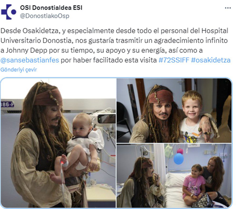 Depp’in çocukları ziyaret etti anlar, Donostia Üniversitesi Hastanesi’nin toplumsal medya hesabında paylaşıldı. Depp, daha evvel “Jack Sparrow” olarak Vancouver, Paris, Londra ve Avustralya’nın Brisbane kentinden başlayarak ABD’nin birçok kentine kadar dünyanın dört bir yanında hastanelerin çocuk servislerini ziyaret etti.