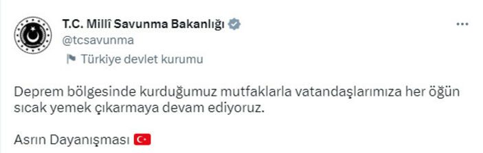 Bakanlık, paylaşımında şu ifadelere yer verdi;Deprem bölgesinde kurduğumuz mutfaklarla vatandaşlarımıza her öğün sıcak yemek çıkarmaya devam ediyoruz.