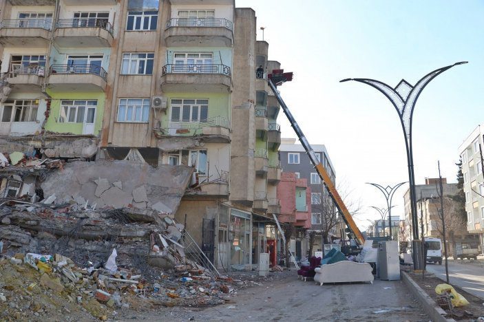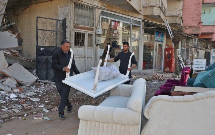 Depremde birçok yakınını kaybeden depremzedeler bir diğer yandan da eşyalarını düşünmeye başladı. Adıyaman’da ekiplerin hasar tespit çalışmalarının ardından depremzedeler; orta ve ağır hasarlı ya da acil yıkımına karar verilen binalarda ve yapıların altındaki iş yerlerinden eşyalarını tahliye ediyor.