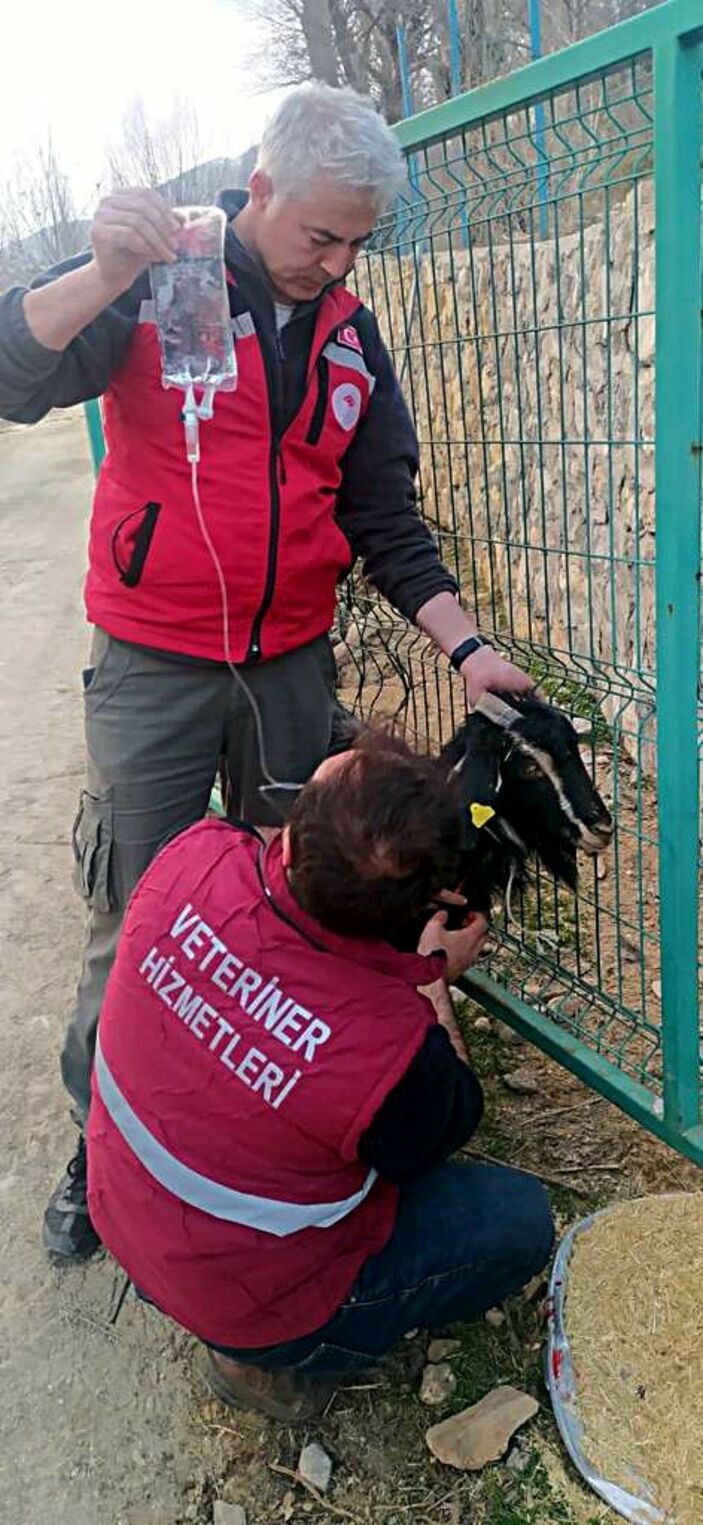 Enkazdan çıkarılan keçilere veteriner hekimler tarafından yapılan ilk müdahalenin ardından su ve yem verildi.