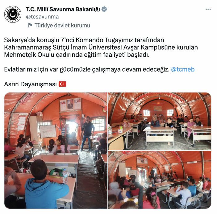 Sakarya’da konuşlu 7’nci Komando Tugayımız tarafından Kahramanmaraş Sütçü İmam Üniversitesi Avşar Kampüsüne kurulan Mehmetçik Okulu çadırında eğitim faaliyeti başladı.