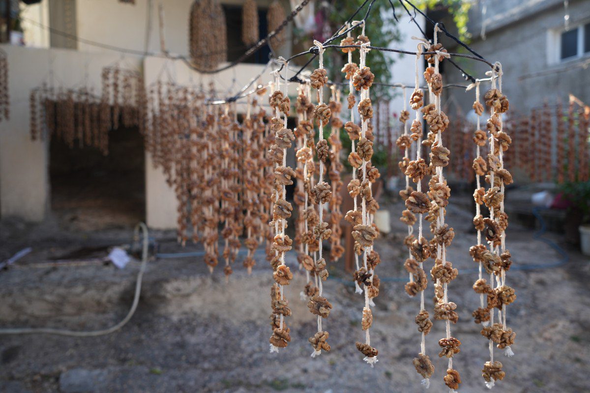 Üzümün suyundan farklı ürünler yapıp para kazanma yollarına giden çiftçiler, ceviz, badem ve fıstığı sucuk haline getirerek mesailerine devam ediyor.
