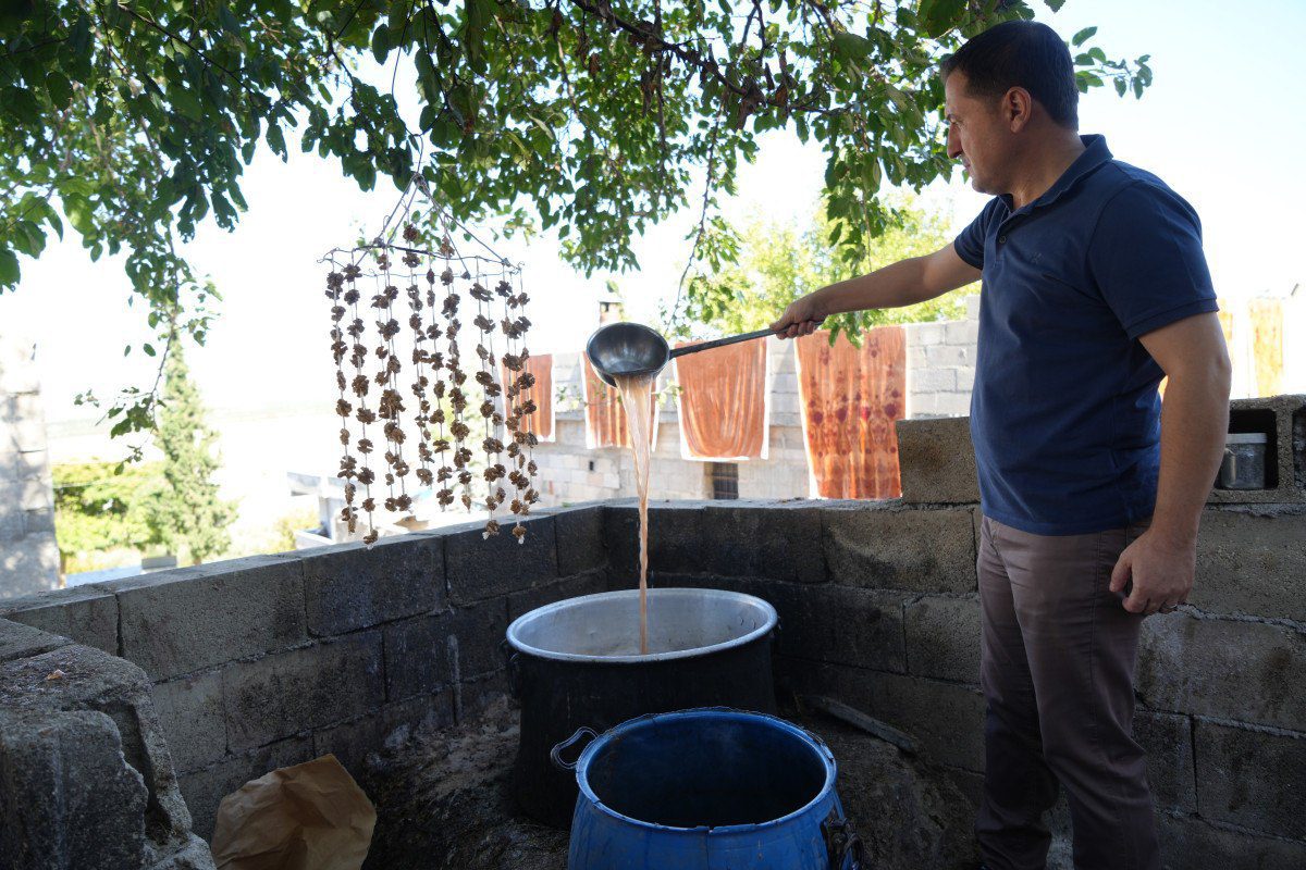 Üzüm hasadının başlamasıyla cevizli sucuk mesaisinin devam ettiğini belirten Kilis Ziraat Odası Başkanı Güven Özdemir, “Kentin çeşitli yerlerindeki hasadı yapılan üzümler, odun ateşinde yanan ocaklarda kaynayarak koyu kıvamlı pekmez haline getiriliyor.