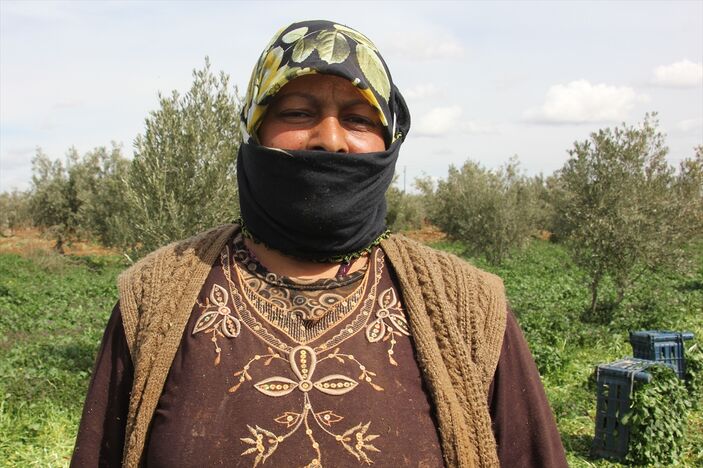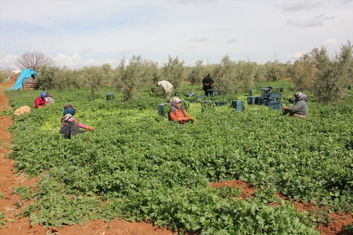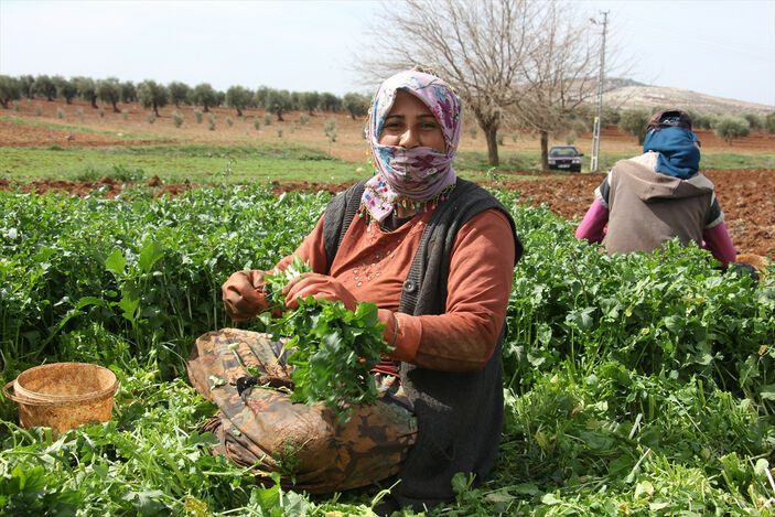 Aile bütçelerine katkıda bulunmak için çalışan kadınlar, tarlada roka ve tere hasadı yapıyor.