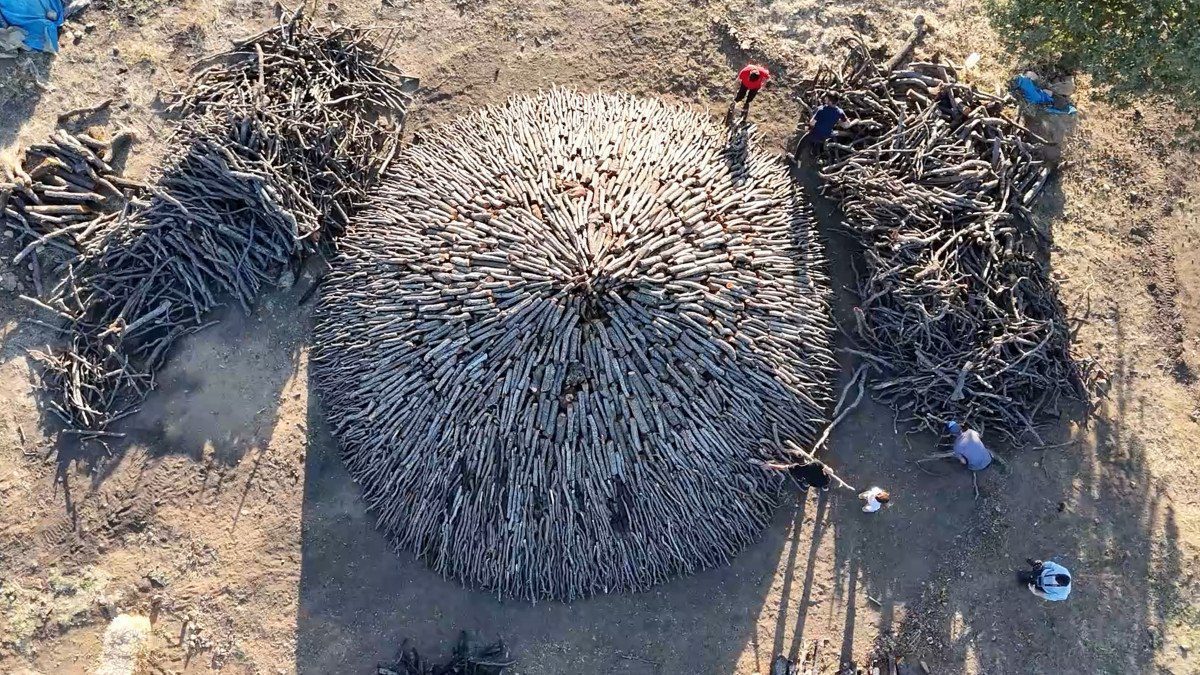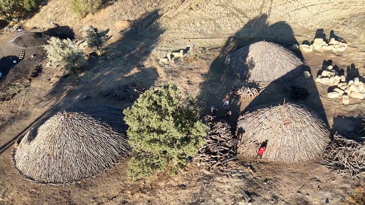 Akabinde koni halinde dizilen odunlar, saman ve toprakla kaplanarak yaklaşık 400-500 derece ısıyla kömüre dönüştürülüyor. Kömürlerin kül olmaması için üretim sürecinde 24 saat nöbet tutuluyor.