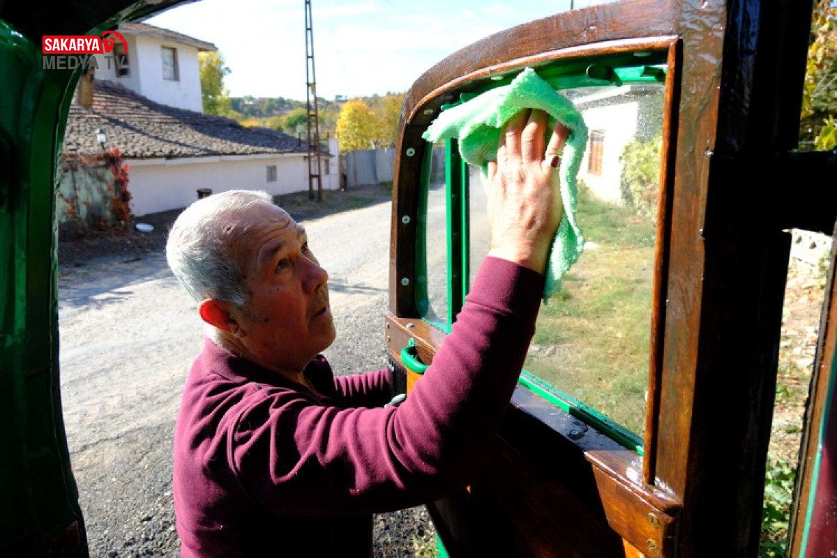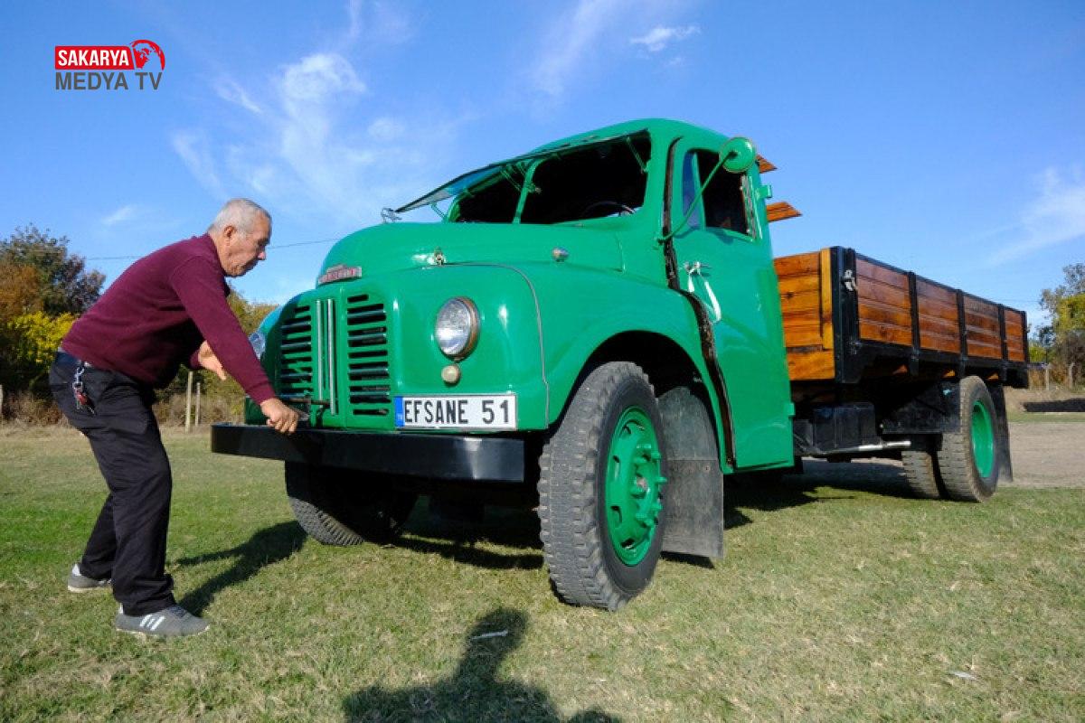 Kamyonun bakımlarını yapan Toraman, kapıları terse açılan ve kol çevrilerek çalıştırılan nostaljik kamyonuna gözü gibi bakıyor.