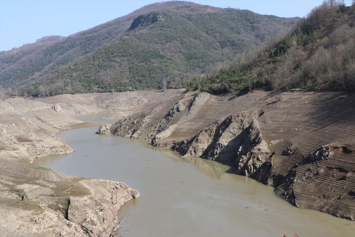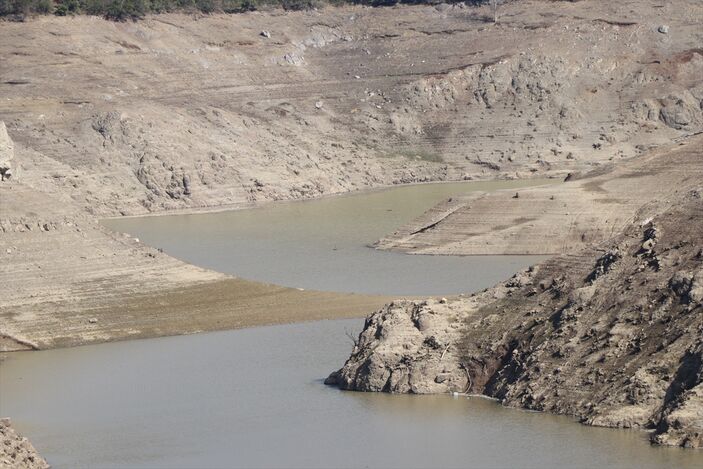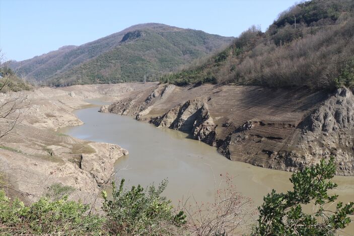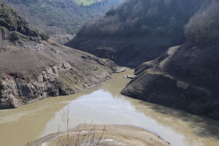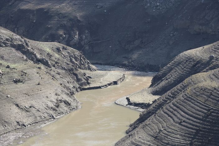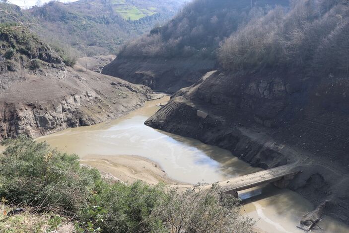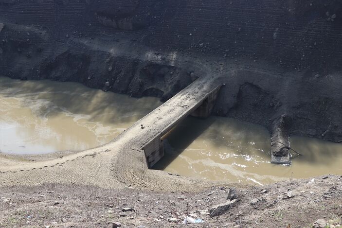 Geçen yıl şubatın son döneminde maksimum seviyeye yaklaşan baraj gölünde, şimdilerde ise havzayı besleyen bir kolda köprü ve su kemerleri kalıntısı görünüyor.