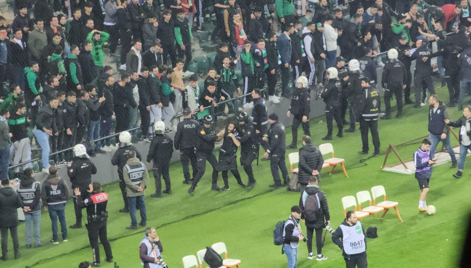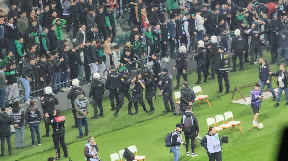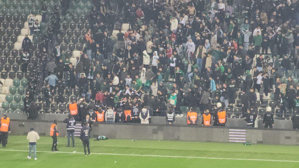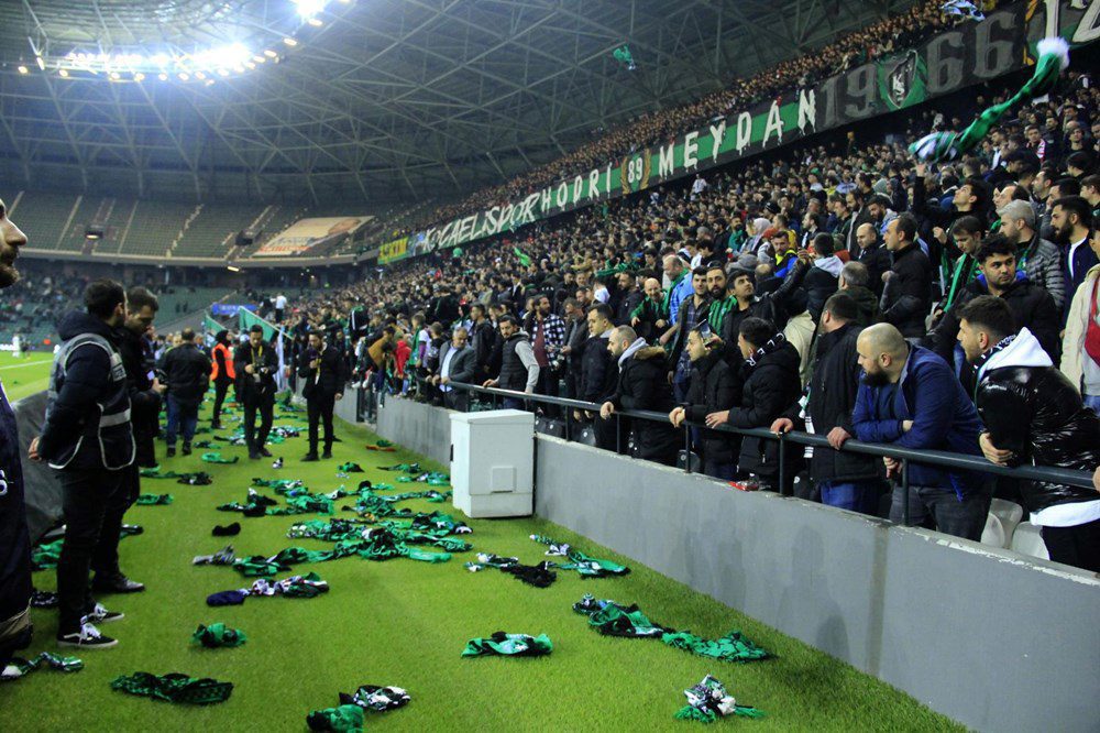 Bazı Kocaelispor taraftarları sahaya girmeye çalışırken, tribünlerde yer alan diğer taraftarlar, Sakaryasporlu taraftara yabancı maddeler attı.
