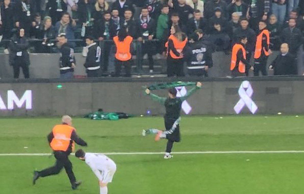 Mücadelenin son dakikalarında ise Sakaryasporlu bir taraftar sahaya atlayarak Kocaelispor tribününe Sakaryaspor atkısı açtı.