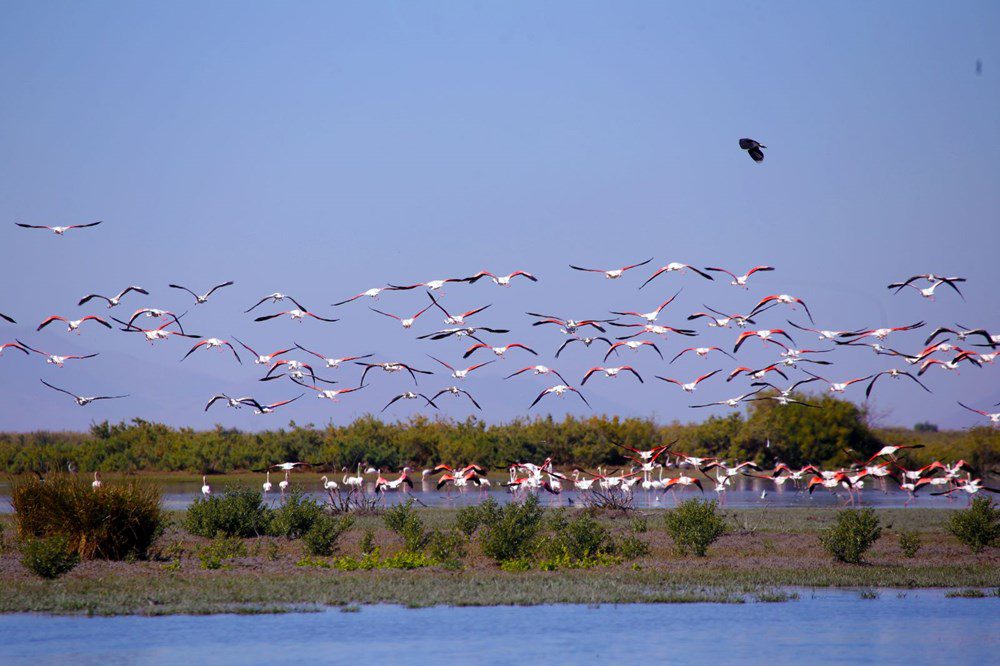 Yetişkinliğe ulaşmasıyla göç kafilesine katılacak olan bu yılın yavrusu flamingolar, sazlıkların üzerinde toplu uçuşlarıyla adeta renk cümbüşü oluşturdu.
