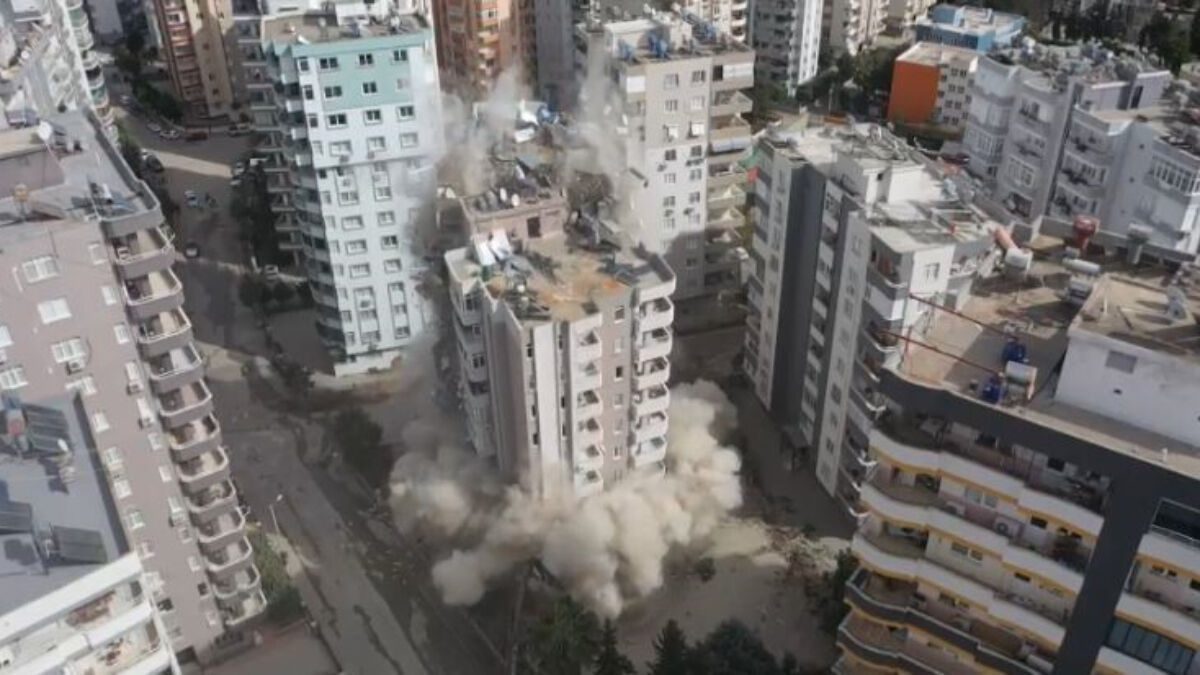 Adana’da depremde ağır hasar alan bina yıkılırken saniyeler içinde yerle bir oldu