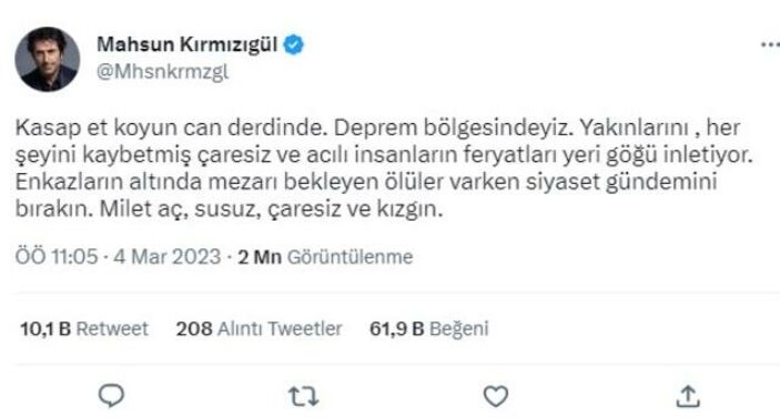 Meral Akşener’in açıklamalarının ardından Twitter hesabından paylaşım yapan Mahsun Kırmızıgül “Kasap et koyun can derdinde. Deprem kaybetmiş çaresiz ve acılı insanların feryatları yeri göğü inletiyor. Enkazların altında mezarı bekleyen ölüler varken siyaset gündemini bırakın. Milet aç, susuz, çaresiz ve kızgın.” dedi.