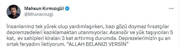 “İnsanlarımız tek yürek olup yardımlaşırken, bazı gözü doymaz fırsatçılar depremzedeleri kazıklamaktan utanmıyorlar. Asansör ve yük taşıyıcıları 5 kat, ev sahipleri kiraları 3 kat arttırmış durumda. Depremzedelerimizin şu an ortak feryadını iletiyorum. “Allah belanızı versin”