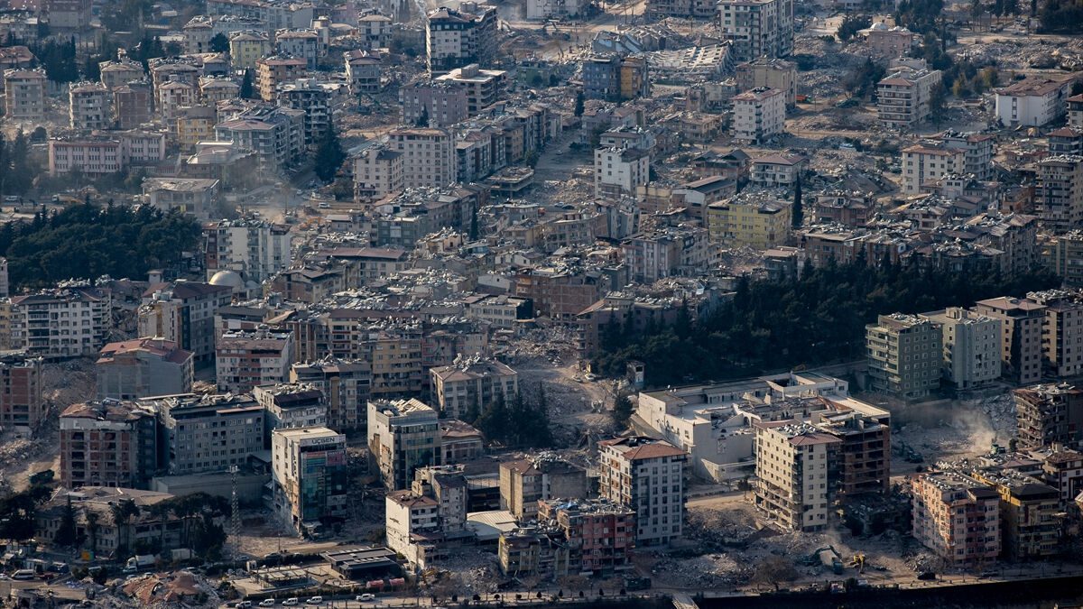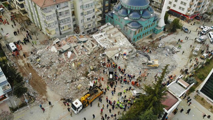 Çöken binada ekiplerin arama kurtarma çalışmaları dron ile görüntülendi.