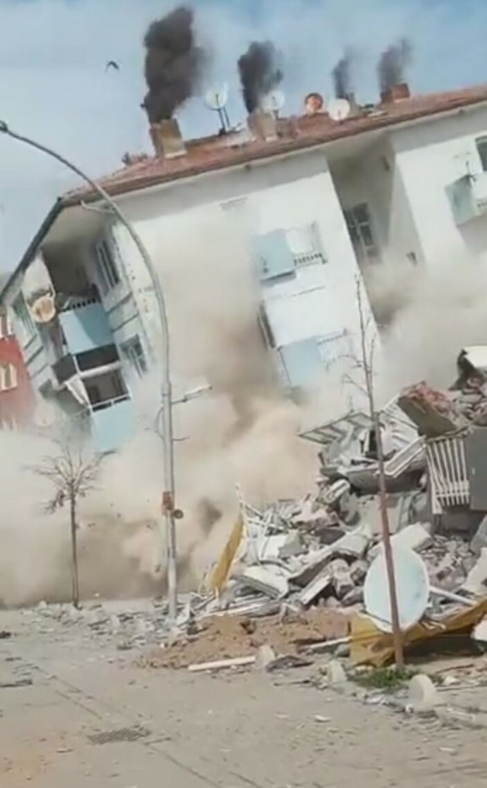 Enkaz altında kalanları arama kurtarma çalışmalarının sürdüğü şehirde, Temelli Caddesi’ndeki 6 katlı binanın yerle bir olduğu anlar kameraya yansıdı.