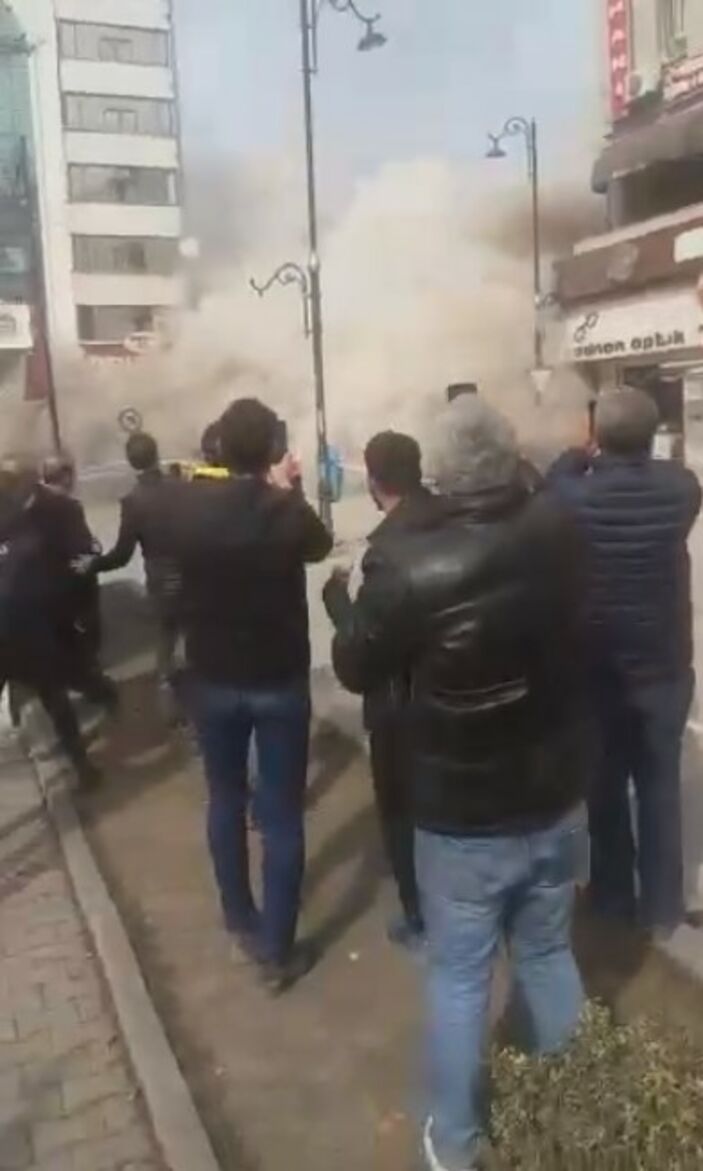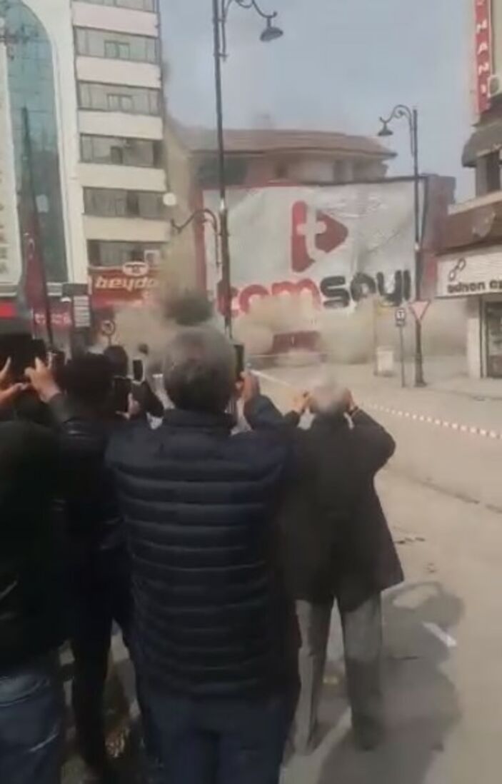 Görüntüde, deprem sonrası zaten ağır hasarlı olan binanın yıkılışını çekmek isteyenlerin adeta birbirleriyle yarıştığı gözlendi.