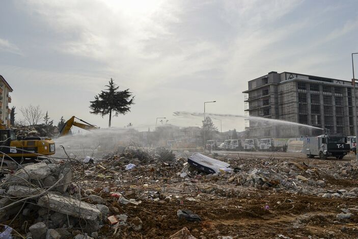 Enkaz kaldırma çalışmalarında polisin TOMA araçları toz kalkmaması için su sıkarken, molozlar ise kamyonlarla hafriyat alanına taşınıyor.