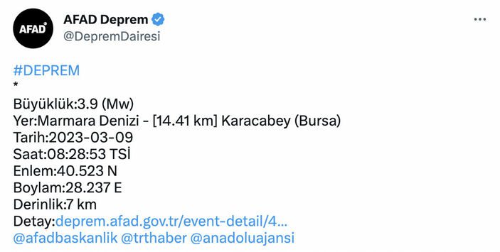 Afet ve Acil Durum Yönetimi Başkanlığı’nın (AFAD) sitesinde yer alan bilgiye göre, Marmara Denizi açıklarında 3,9 büyüklüğünde deprem meydana geldi.