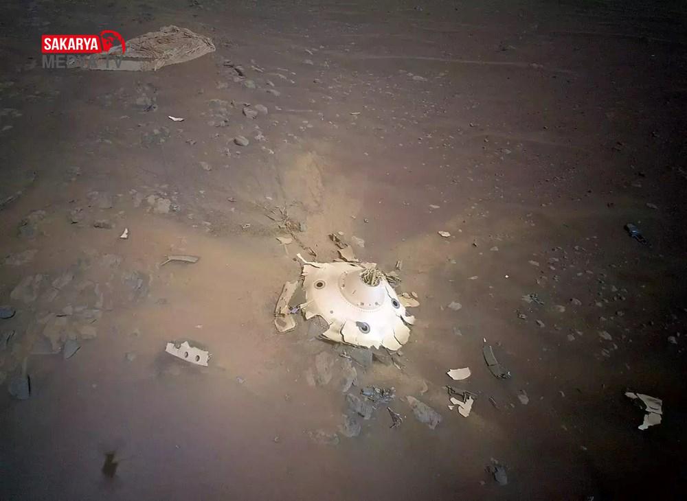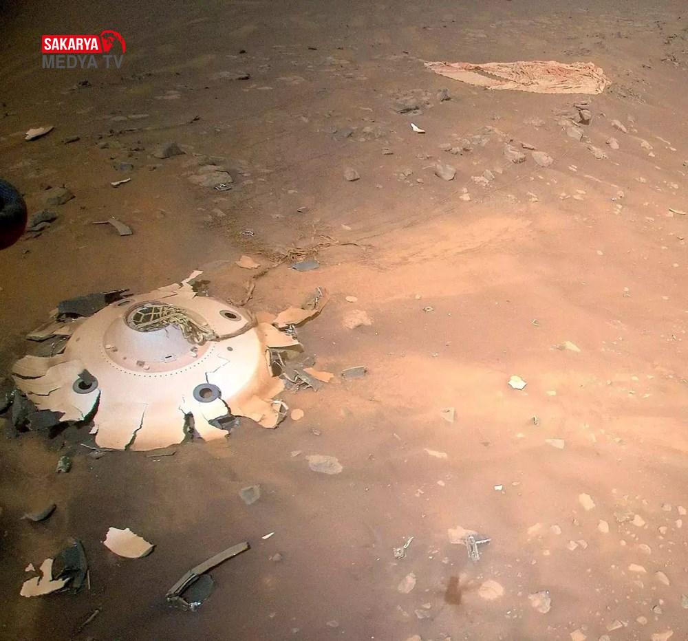 Mars’ın kumlarında yatan bir enkazı görüntülerken, sonsuza dek orada kalabilecek parçaları ortaya çıkardı. Ancak helikopterin yakaladığı bu manzaradaki enkazın Perseverance ile birlikte Ingenuity’nin Mars yüzeyine inmek için kullanılan iniş ekipmanının bir parçası olduğu ortaya çıktı.