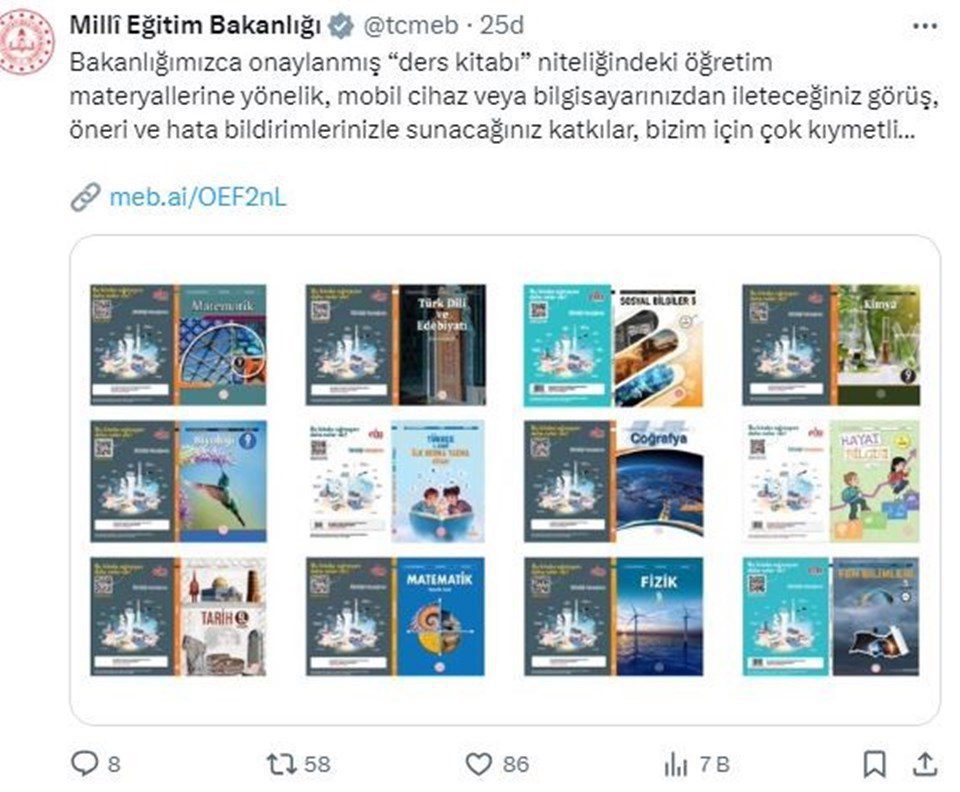MEB’in resmi toplumsal medya hesabından yapılan duyuruda; “Bakanlığımızca onaylanmış “ders kitabı” niteliğindeki öğretim gereçlerine yönelik, taşınabilir aygıt yahut bilgisayarınızdan ileteceğiniz görüş, teklif ve yanılgı bildirimlerinizle sunacağınız katkılar, bizim için çok kıymetli… ” denildi.
