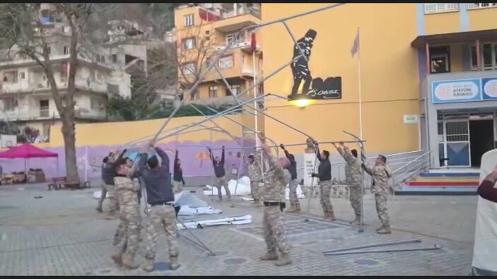 İlk günden itibaren çalışmalarda büyük bir mücadele ortaya koyan Mehmetçik, bu kez depremzede çocukların eğitimi için harekete geçti. Depremden en çok etkilenen illerden biri olan Hatay’daki bir okula giden güvenlik güçleri, burada çadır sınıflar yapmak için kolları sıvadı.