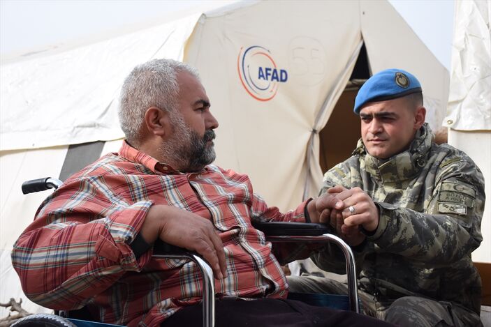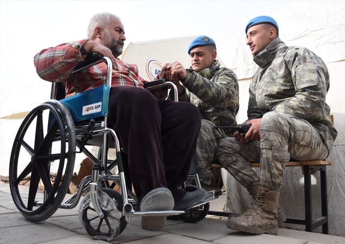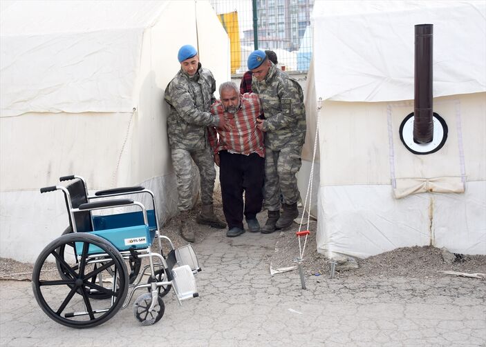 Çadır kentte konaklayan 20 yıldır yürümekte güçlük çeken 50 yaşındaki bedensel engelli Mehmet Nuri Ulu da Mehmetçiğin “şefkat eli” uzattığı depremzedelerden birisi.