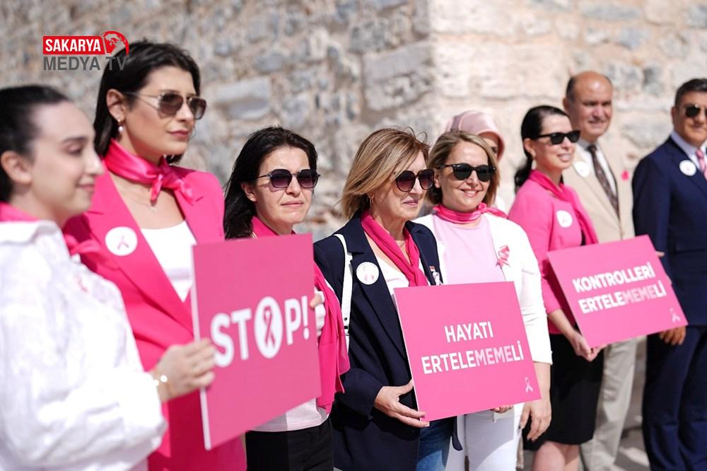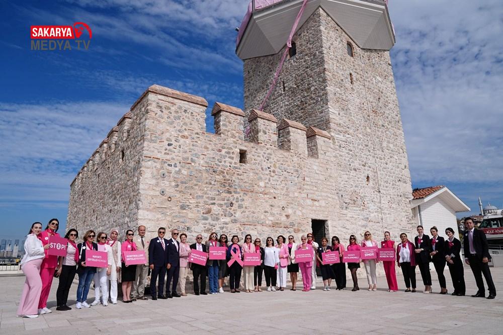 Katılımcılar, daha sonra pembe kurdele asılan kule önünde pankartlarıyla hatıra fotoğrafı çektirdi.