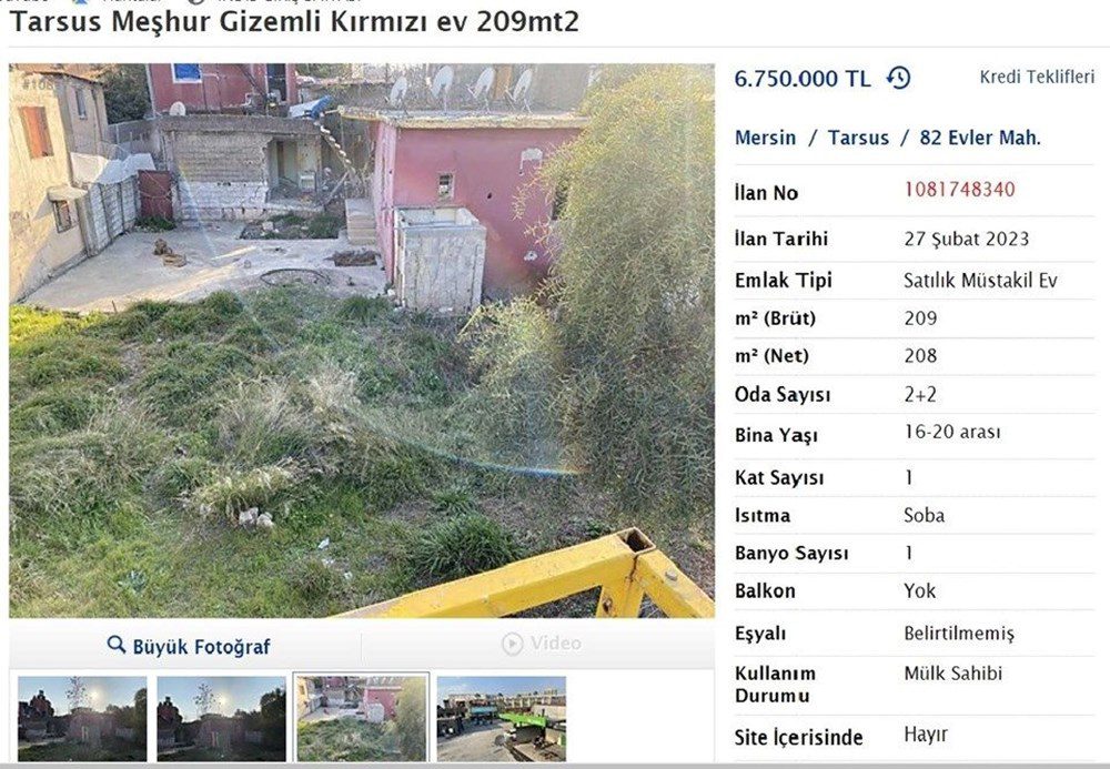 27 Şubat tarihli ”Tarsus meşhur gizemli kırmızı ev 209 metrekare” başlıklı ilanda, ev için 6 milyon 750 bin lira istendiği görüldü.