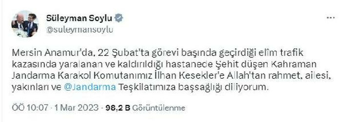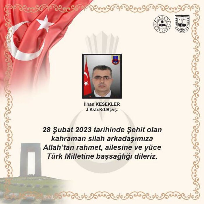 Jandarma Genel Komutanlığı’nın Twitter’daki hesabından yapılan paylaşımda da “28 Şubat’ta şehit olan kahraman silah arkadaşımıza Allah’tan rahmet ailesine ve yüce Türk milletine başsağlığı dileriz” denildi.