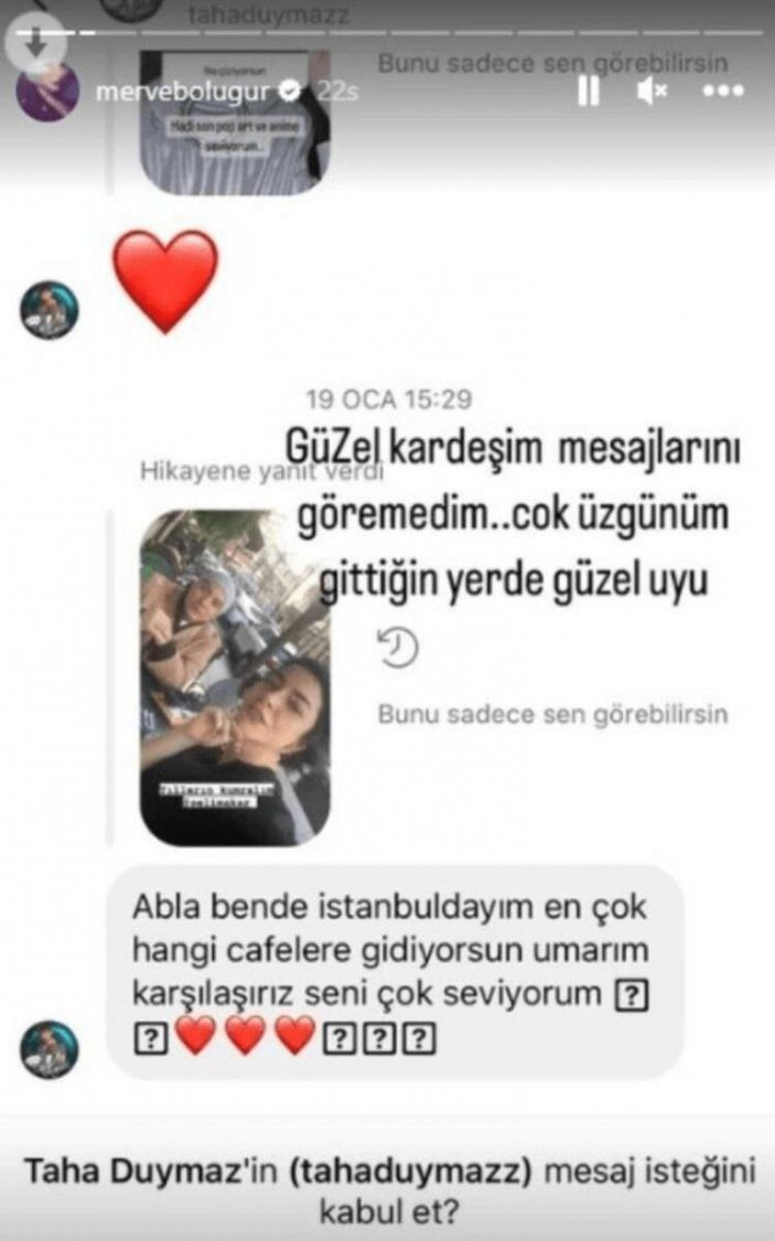 Taha Duymaz’ın vefatının ardından Instagram üzerinden kendisine attığı mesajları fark eden Merve Boluğur, yaşadığı pişmanlığı dile getirdi.