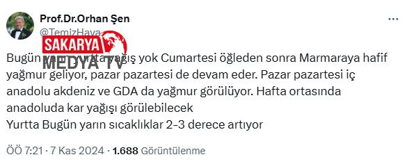Meteoroloji uzmanı Orhan Şen, X hesabı üzerinden haftalık hava kestirimini açıkladı. Şen, gelecek haftayı işaret ederek nerelerde yağmur ve kar görüleceğini paylaştı. Şen, “Bugün ve yarın yurtta yağış yok. Cumartesi öğlenden sonra Marmara’ya hafif yağmur geliyor. Pazar, pazartesi de devam eder. Pazar pazartesi İç Anadolu, Akdeniz ve GDA (Güney Doğu Anadolu) da yağmur görülüyor. Hafta ortasında Anadolu’da kar yağışı görülebilecek, yurtta bugün ve yarın sıcaklıklar 2-3 derece artıyor.” sözlerini kullandı.