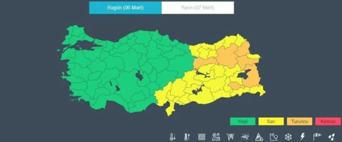 Meteoroloji Genel Müdürlüğü; Adana, Adıyaman, Ağrı, Artvin, Bingöl, Bitlis, Diyarbakır, Elazığ, Erzincan, Erzurum, Gaziantep, Giresun, Gümüşhane, Hakkari, Hatay, Kars, Malatya, Kahramanmaraş, Mardin, Muş, Rize, Siirt, Trabzon, Tunceli, Şanlıurfa, Van, Bayburt, Batman, Şırnak, Ardahan, Iğdır, Kilis ve Osmaniye illerini uyardı.